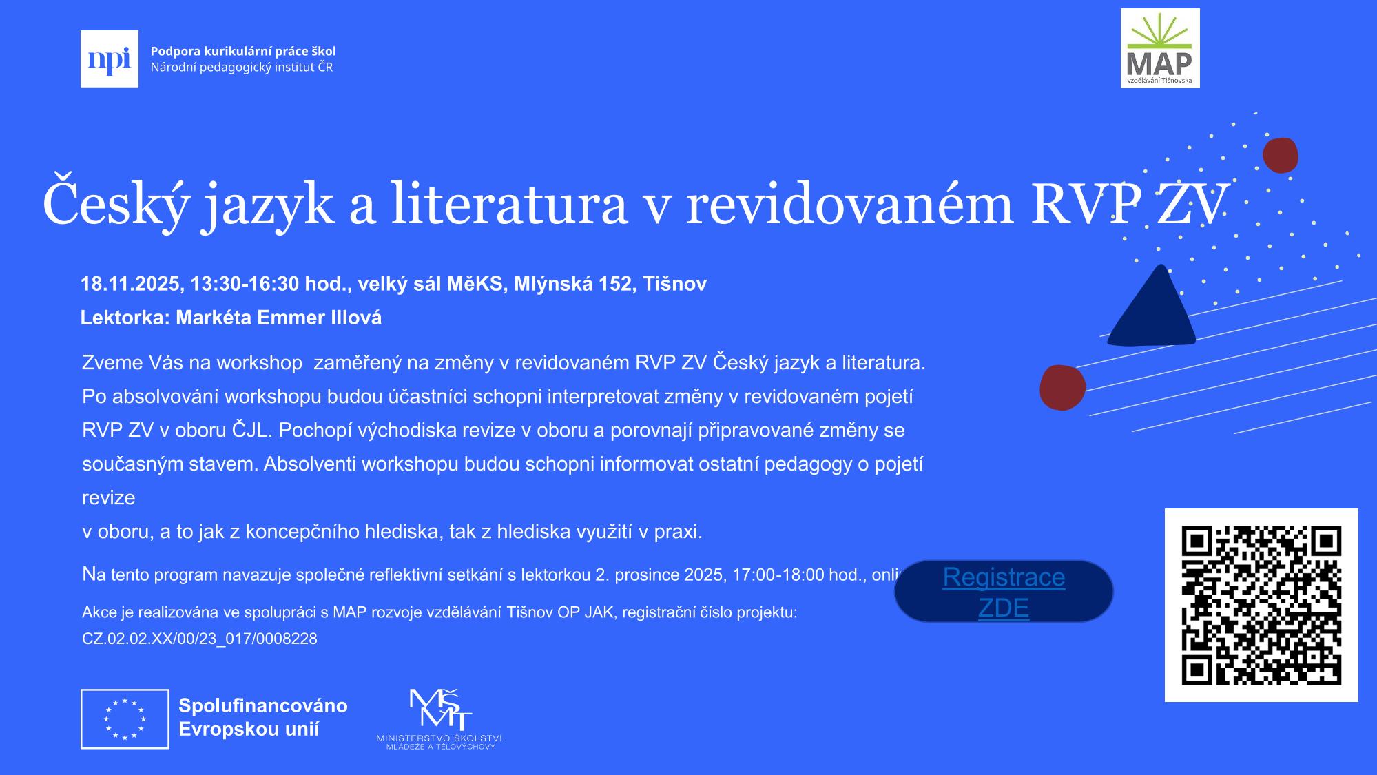 Přidej do kalendáře 2025-11-18 13:30:00 2025-11-18 16:30:00 Český jazyk a literatura v revidovaném RVP ZV Workshop zaměřený na změny v revidovaném RVP ZV Český jazyk a literatura. Určeno pro koordinátory ŠVP ZV, ředitele škol a školských zařízení, učitele 2. st. ZŠ.Lektor: Mgr. Markéta Emmer Illová MěKS Tišnov, Mlýnská 152, velký sál pod kinem MAP Tišnov chadimova@maptisnov.cz Europe/Prague public